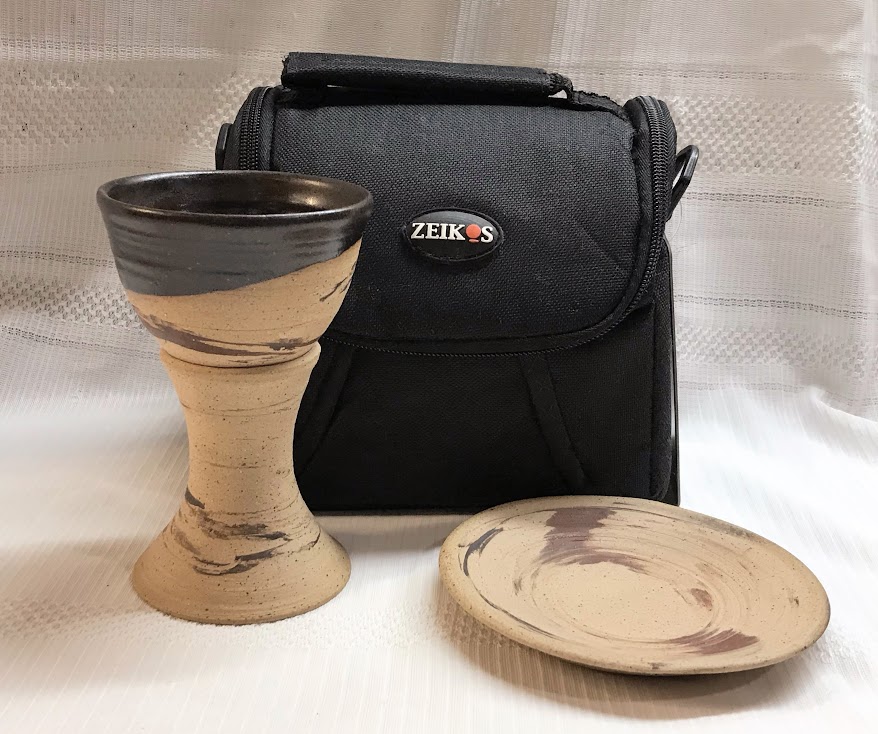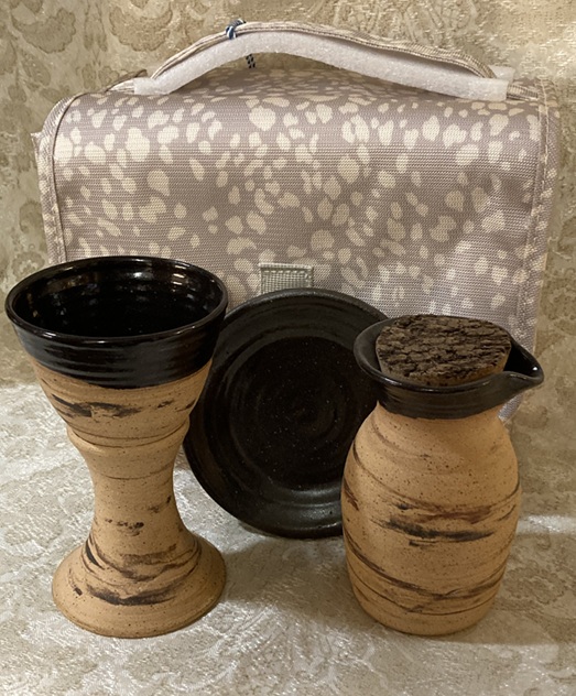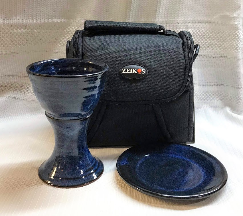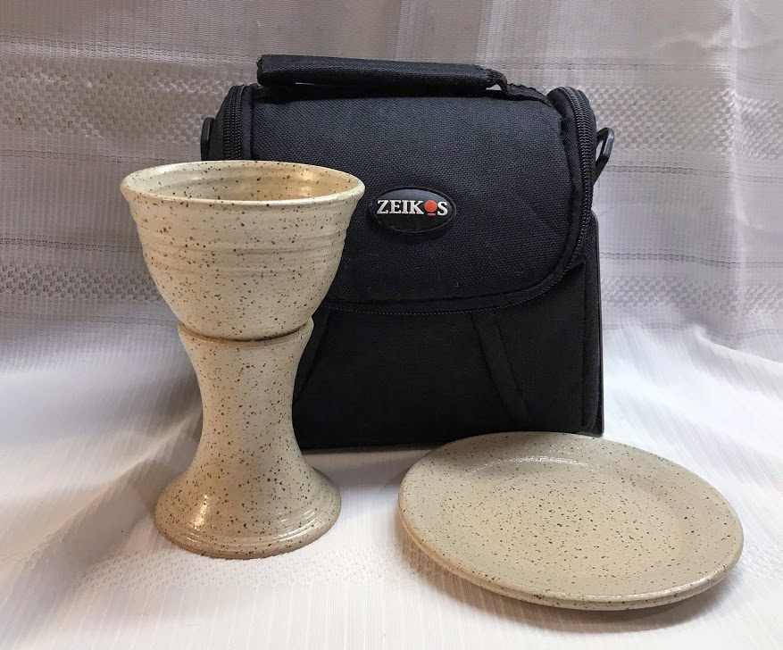 Special - "Pastor" Travel Communion Set and lightweight patterned unpadded carrying Case. The pottery is in our "Memorial" pattern, mostly unglazed. Free shipping in the USA. More Choices